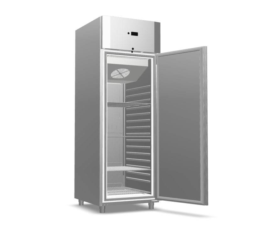 - Elegant and space-saving design with 4 GN 2⁄1 shelves and grid guides